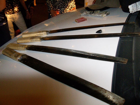 Kiểm tra hành chính, các trinh sát phát hiện nhóm gồm 10 thanh niên trong tiếng nhạc chát chúa trên 2 xe taxi này đem theo 4 con dao dài.