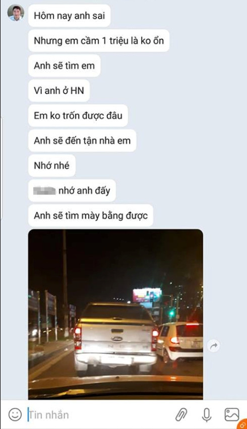 “Tôi nghĩ mọi việc đã xong xuôi, thì lúc về nhà thấy có cuộc gọi nhỡ. Sau đó là hàng loạt tin nhắn trên Zalo của người đàn ông va chạm với tôi lúc trước. Anh này dù nói mình đã sai nhưng lại đòi tôi phải trả lại 1 triệu đồng đã cầm, nếu không, anh ta dọa sẽ tới cơ quan, tới nhà tôi, rồi về tận quê tôi. Tôi vô cùng bức xúc với lối hành xử đó nên đã chia sẻ câu chuyện lên mạng xã hội”, anh Q. cho biết.
