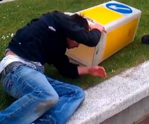 Chàng thanh niên bị kẹt đầu trong hộp chỉ dẫn giao thông