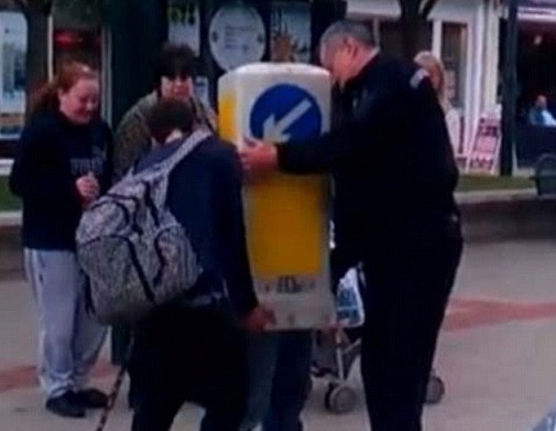 Cuối cùng, một cảnh sát đã được gọi tới hiện trường và cùng với bạn của anh này “giải cứu” anh khỏi tấm biển.