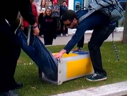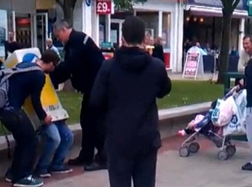 Khách mua sắm ở thị trấn Hemel Hempstead ngày hôm qua (24/6) đã được một phen vừa lo lắng vừa buồn cười vỡ bụng khi chứng kiến cảnh một người đàn ông đi tới đi lui trên đường với một chiếc biển hiệu giao thông bị mắc kẹt trên đầu.