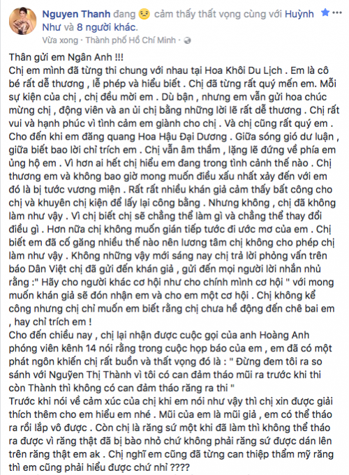 Ngay trong chiều tối ngày 15-11, Nguyễn Thị Thành đã viết trên trang cá nhân bày tỏ sự yêu quý của mình trước đây đối với Ngân Anh trong khoảng thời gian cả hai cùng thi Hoa khôi Du lịch, bởi lúc đó thấy Ngân Anh rất dễ thương, lễ phép. Tuy nhiên, sau hát ngôn này của Ngân Anh, Nguyễn Thị Thành cho biết, đã không dấu nổi sự thất vọng.