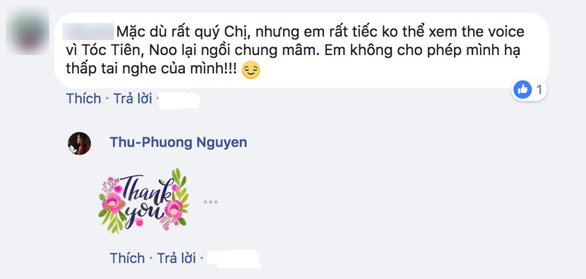 Nói vậy là bởi có rất nhiều khán giả để lại dòng bình luận tỏ ý không thích, không đồng tình với việc Tóc Tiên và Noo Phước Thịnh cùng ngồi ghế HLV với Thu Phương. Thậm chí, nhiều người còn cho rằng trong số 4 vị HLV thì Thu Phương thuộc đẳng cấp riêng, không đứng chung hàng với ba cái tên còn lại. Những tranh luận trái chiều được cộng đồng mạng đưa lên trang Facebook của Thu Phương khiến cô bị dồn vào thế khó xử khi nói kiểu gì cũng dễ bị “hớ”.