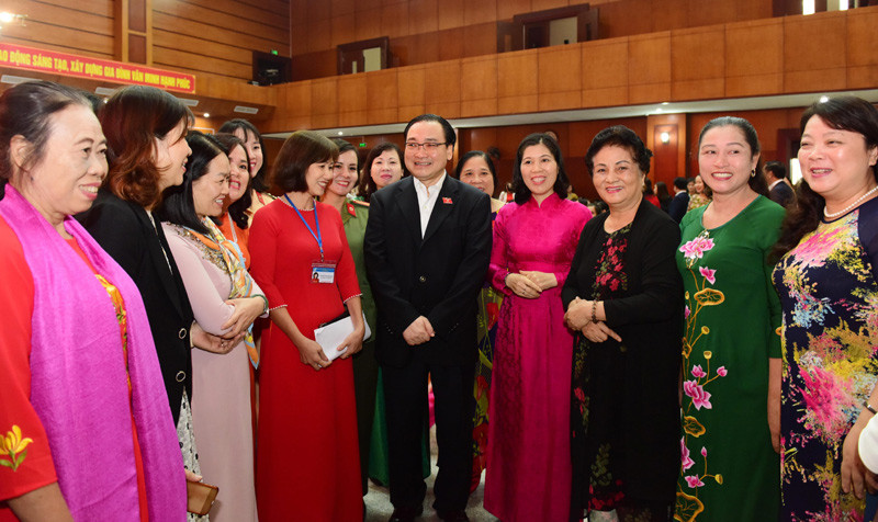 Bí thư Thành ủy Hà Nội Hoàng Trung Hải với các đại biểu phụ nữ thành phố