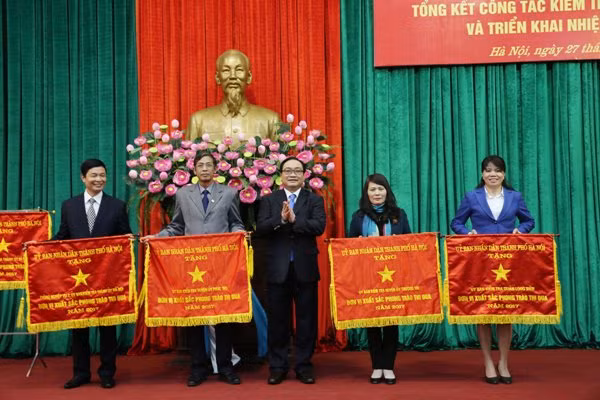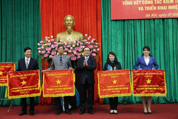 Bí thư Thành ủy Hoàng Trung Hải trao cờ của Thành phố cho các đơn vị xuất sắc trong phong trào thi đua về công tác kiểm tra, giám sát năm 2017