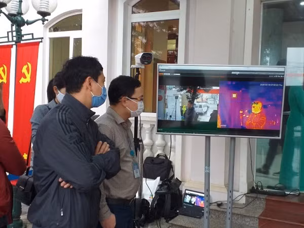 Máy đo thân nhiệt các đại biểu trước khi bước vào trụ sở Huyện ủy Chương Mỹ