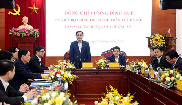 Sáng nay, 19-3, Ủy viên Bộ Chính trị, Bí thư Thành ủy Hà Nội Vương Đình Huệ đã làm việc với Huyện ủy Chương Mỹ về công tác phòng, chống dịch Covid-19; kết quả thực hiện nhiệm vụ chính trị năm 2019, nhiệm vụ trọng tâm năm 2020; công tác chỉ đạo đại hội đảng bộ cơ sở và Đại hội lần thứ XXIV Đảng bộ huyện, nhiệm kỳ 2020-2025. Phó Bí thư Thành ủy - Chủ tịch UBND TP Nguyễn Đức Chung cùng dự.