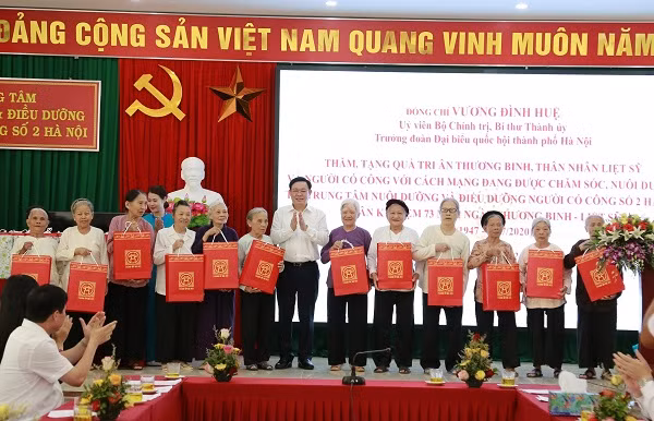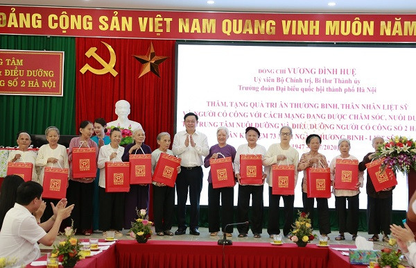 Nhân dịp này, Bí thư Thành ủy Vương Đình Huệ đã tặng quà cho thương binh, thân nhân liệt sỹ, người có công và cán bộ, công nhân viên Trung tâm Nuôi dưỡng và Điều dưỡng người có công số 2 Hà Nội.
