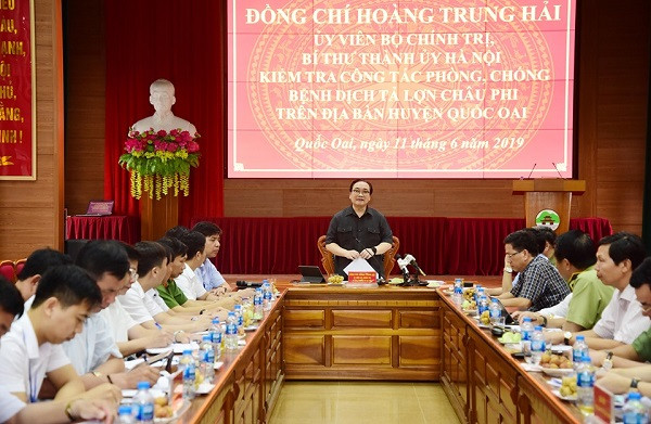 Báo cáo với Bí thư Thành ủy, Chủ tịch UBND huyện Quốc Oai Đỗ Huy Chiến cho biết, ngày 11-3-2019, trên địa bàn huyện bắt đầu xuất hiện ổ dịch tả lợn châu Phi (được ghi nhận đầu tiên tại xã Yên Sơn và Phượng Cách) và đến nay dịch đã lan ra tất cả 21 xã trong huyện.