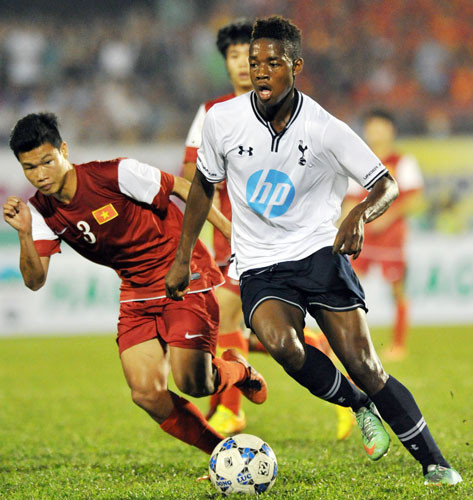Không còn cơ hội cạnh tranh thứ hạng tại giải, U19 VN chỉ còn mục tiêu duy nhất, đó là căng sức đá với U19 Tottenham để đáp lại tình cảm mà đông đảo khán giả đã dành cho mình. Với tinh thần đó, U19 VN nhập cuộc rất quyết tâm, cố gắng đẩy nhanh nhịp độ tấn công sau tiếng còi khai cuộc. Tuy nhiên, trong khi các học trò của HLV Graechen Guillume còn chưa tìm được cách đưa bóng vào lưới đối thủ thì U19 Tottenham đã có bàn vượt lên dẫn 1-0, ngay trong tình huống tấn công đầu tiên ở phút 15. Cy Goddard đột phá tốc độ bên cánh phải, loại bỏ Hồng Duy trước khi căng ngang vào trong để Daniel Akindayini dễ dàng đệm bóng tung lưới thủ thành Văn Trường.