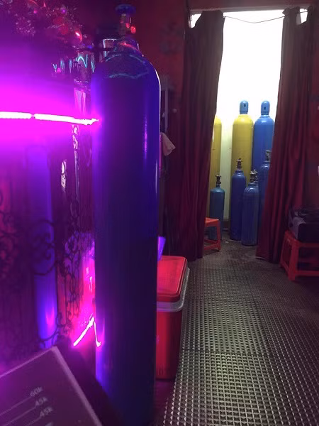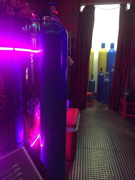 Mặc dù vừa bị xử phạt, tại quán vẫn có rất nhiều bình khí N20 chuẩn bị được bơm bóng cười cho khách