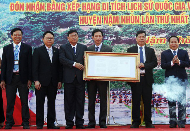 Lễ công bố quyết định công nhận Bảo vật quốc gia đối với bia Lê Lợi và đón nhận Bằng xếp hạng Di tích lịch sử quốc gia đối với địa điểm lưu niệm vua Lê Thái Tổ tại xã Lê Lợi (huyện Nậm Nhùn). (Ảnh: Việt Hoàng)