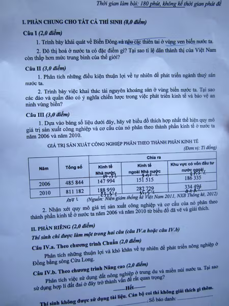 Bạn Nguyễn Thị Bằng (Hà Tĩnh – dự thi vào khoa Việt Nam học – Đại học SPHN) cũng tỏ ra rất phấn khởi sau khi nhận đề thi môn địa lý: “Em cũng đoán chắc sẽ có những câu hỏi liên quan đến biển đảo và tài nguyên khoáng sản thế nên em học rất kỹ những phần này. Em làm bài rất tốt, khoảng 80 – 85%, những câu hỏi không quá khó và đánh lừa thí sinh như khối A, em rất vui vì môn thi đầu tiên kết thúc đạt kết quả tốt”.