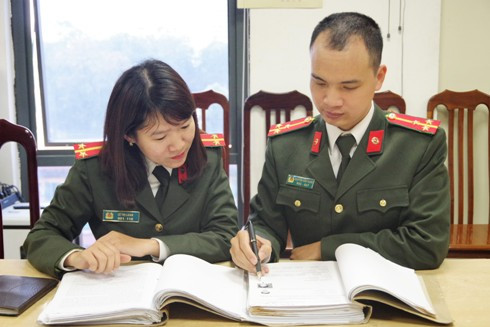 Thượng úy Nguyễn Văn Hạnh trao đổi nghiệp vụ với đồng nghiệp