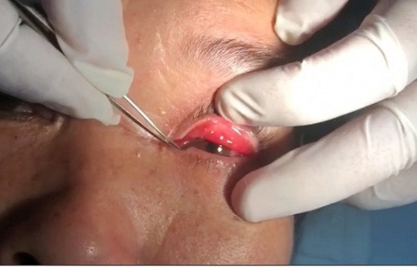 Bác sĩ gắp con vắt đang bám chặt góc trong mắt của nữ bệnh nhân ra ngoài