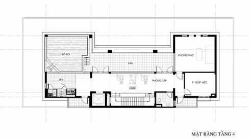 Tầng 4 dành cho các hoạt động thể thao và chăm sóc sức khỏe như phòng tập, bể bơi, phòng spa và một khoảng sân rộng. Bể rộng 27 m2 nằm trên tầng cao nhất đòi hỏi kết cấu nhà phải vững chắc để chịu trọng tải của nước. Phần chống thấm được thi công cẩn thận. Phía trên có mái trong, xung quanh là thành kính đảm bảo an toàn tránh mưa nắng nhưng vẫn cho không khí, ánh sáng chiếu vào.