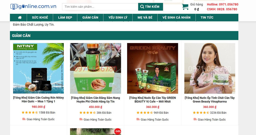 Những dòng sản phẩm giảm cân luôn được chị em quan tâm sâu sắc. Tuy nhiên, hầu hết vẫn còn e ngại vì thị trường đã có quá nhiều hàng trôi nổi, không đảm bảo về nguồn gốc, xuất xứ. Tại Bigonline.com.vn, bạn có thể dễ dàng tìm được những sản phẩm giảm cân chính hãng, có giấy tờ đầy đủ.