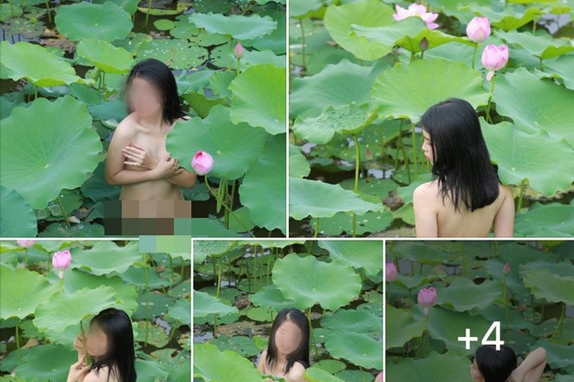 Cụ thể, theo những hình ảnh được chia sẻ có thể thấy cô gái trong hình đang khỏa thân bên trong đầm sen và tạo những dáng vô cùng phản cảm như dùng tay che hai bầu ngực, hoặc quay hoàn toàn vòng 3 về phía ống kính người chụp.