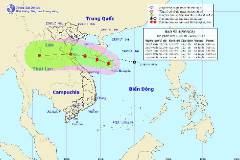 Theo tin từ Trung tâm dự báo Khí tượng thủy văn Trung ương, hồi 04 giờ ngày 24-7, vị trí tâm bão ở vào khoảng 17,3 độ Vĩ Bắc; 111,2 độ Kinh Đông, cách đảo Hải Nam (Trung Quốc) khoảng 150km về phía Đông Nam. Sức gió mạnh nhất ở vùng gần tâm bão mạnh cấp 8, giật cấp 9-10.