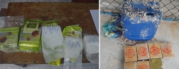 Qua kiểm tra các gói nhựa trên có nhãn mác bên ngoài là gói trà nhưng bên trong chứa nhiều túi nhựa màu trắng (có chữ Trung Quốc). Bên trong các túi nhựa có chứa nhiều chất màu trắng, nghi là ma túy đã được đưa đi giám định.