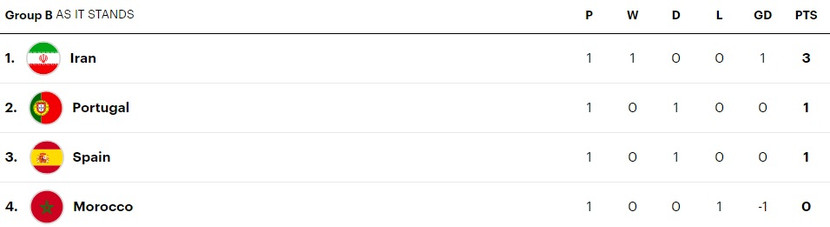 Cùng với việc Iran bất ngờ thắng Ma rốc ở cuộc đọ sức trước đó, Bồ Đào Nha và Tây Ban Nha tạm chia sẻ nhau vị trí thứ 2 của bảng B sau lượt trận đầu tiên với cùng 1 điểm.