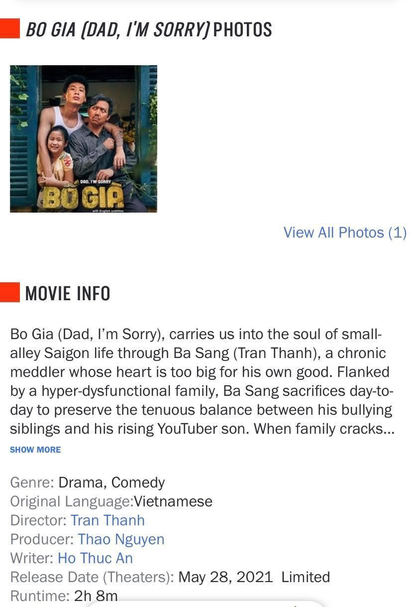 Mới đây tài khoản mạng xã hội của một người khá uy tín trong lĩnh vực phê bình đánh giá phim ảnh trong nước và quốc tế đăng tải thông tin chia sẻ thông tin, phim "Bố già" nhận về 29% (trên tổng số mức đánh giá 100% điểm số dành cho chất lượng phim - PV) trên trang web Rotten Tomatoes và được giới phê bình quốc tế nhận định là "lan man, sến súa, ngớ ngẩn, thoại như hét vào mặt nhau".