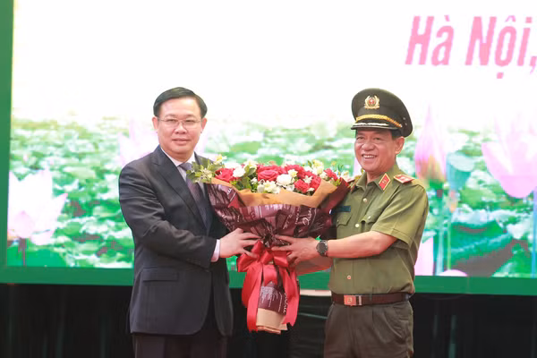 Đồng chí Vương Đình Huệ, Ủy viên Bộ Chính trị, Bí thư Thành ủy Hà Nội tặng hoa chúc mừng Trung tướng Đoàn Duy Khương hoàn thành nhiệm vụ