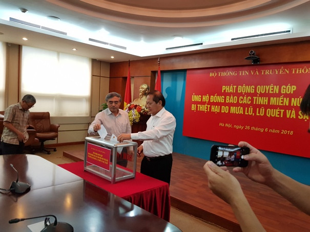 Sáng 26-6, Bộ TT-TT, Công đoàn TT-TT đã tổ chức phát động quyên góp, ủng hộ trực tiếp giúp đồng bào các tỉnh vùng núi phía Bắc để khắc phục thiệt hại do mưa lũ, lũ ống và sạt lở đất để đồng bào sớm ổn định sản xuất và cuộc sống.