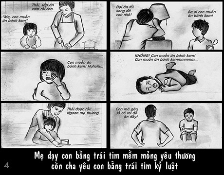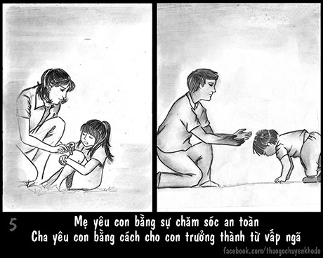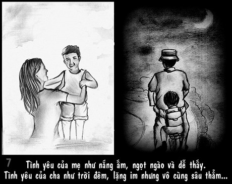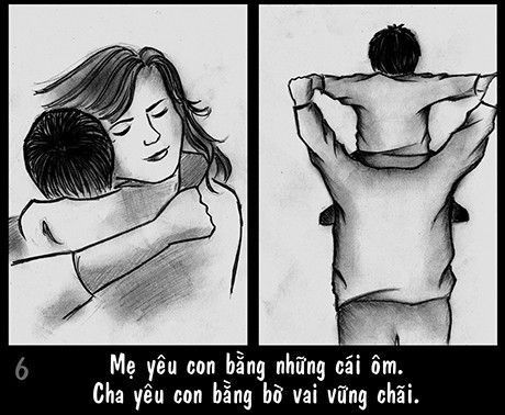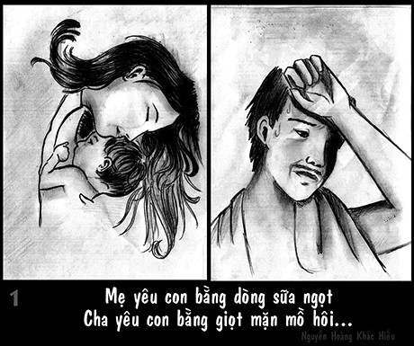 Bộ tranh của thầy Khắc Hiếu đã phần nào nói lên tấm lòng của người cha dành cho con cái. Không giống như tình cảm ấm áp được thể hiện qua những cái ôm, những lời động viên ngọt ngào của mẹ, tình cảm của cha có thể gai góc, xù xì, có thể đanh thép bằng các hình thức kỷ luật nhưng cha luôn mong những điều tốt đẹp đến với con cái.