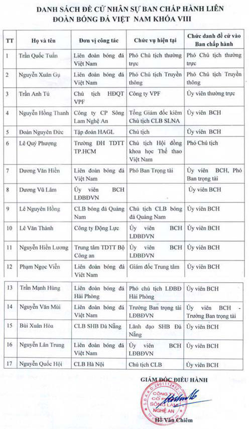 CLB SLNA chỉ giới thiệu phó chủ tịch và ủy viên ban chấp hành cho đại hội