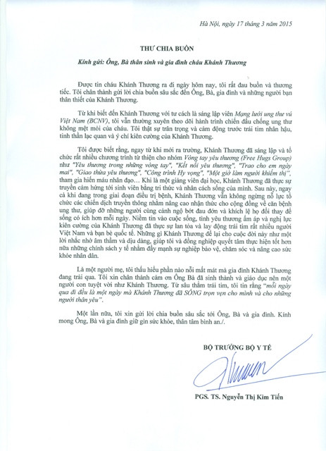 Thư chia buồn của Bộ trưởng Bộ Y tế gửi gia đình Khánh Thương