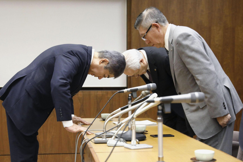 Bộ trưởng Iwaya (trái) xin lỗi trong cuộc gặp với Tỉnh trưởng tỉnh Akita hôm 17-6