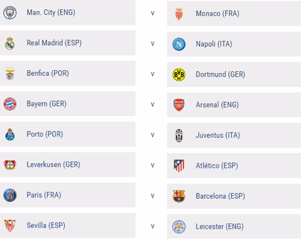 Đội bóng cần phải ăn mừng đầu tiên là Man City, khi lá thăm may rủi đưa họ chỉ phải gặp Monaco, cái tên được đánh giá thấp nhất ở vòng 16 đội này.