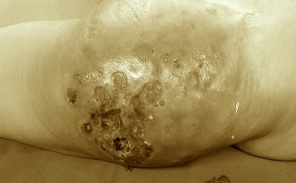 Theo thông tin từ Bệnh viện Trung ương Quân đội 108 (Bệnh viện 108), nữ bệnh nhân 45 tuổi kể trên nhập viện trong tình trạng vùng mông căng cứng, khó chịu, loét.