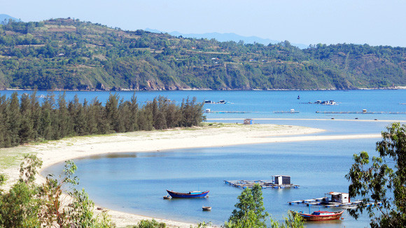 Những bãi tắm trong vịnh Vân Phong bốn mùa xanh mát thanh bình dưới nắng. Cát biển trắng tinh chứ không mang màu vàng nhạt như biển Nha Trang hay vàng đậm ngả sang nâu như biển Vũng Tàu. Núi Đá Bia xa mờ hiện lên trên nền biển. Chếch về bên phải, hải đăng Đại Lãnh sừng sững uy nghi.