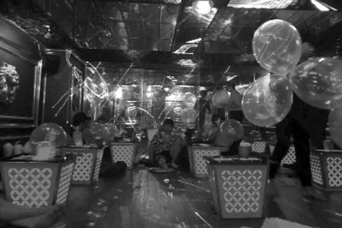 Quan sát các bàn bên cạnh, những thanh niên chẳng buồn để ý xung quanh, mà chuyên tâm lắc lư theo tiếng nhạc và… chơi bóng. Cứ độ 5 phút, nhân viên phục vụ lại xuất hiện từ căn phòng bên cạnh, cầm theo chùm 5 quả bóng, sẵn sàng đáp ứng nhu cầu của các “thượng đế”. Điều dễ thấy là bàn nào cũng chỉ có 1 chai nước suối hoặc bia để… tượng trưng, còn tất cả ai cũng ngậm bóng. Nhiều người đứng dậy lắc lư theo tiếng nhạc với một quả bóng thường trực trên miệng.