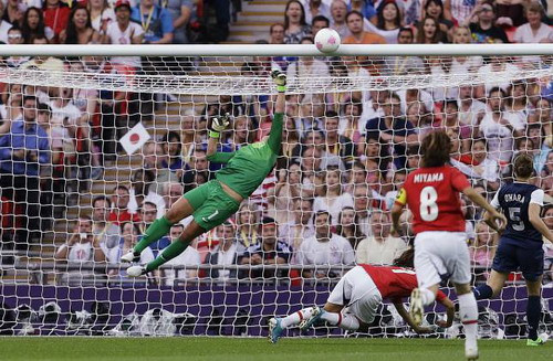 Một pha bay người cứu bóng xuất thần của thủ môn Hope Solo (áo xanh) - Ảnh: Reuters