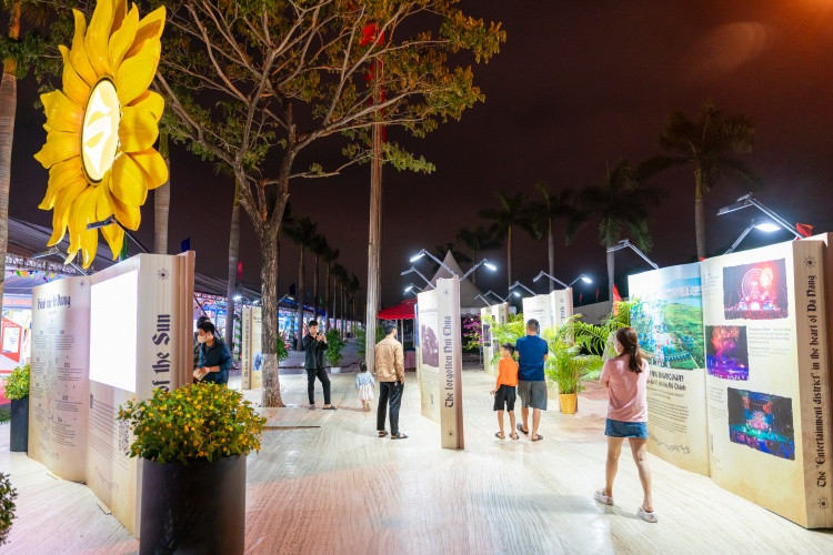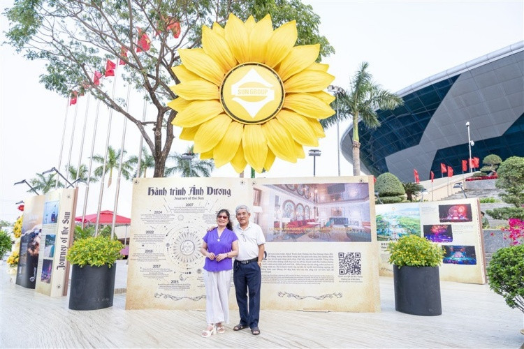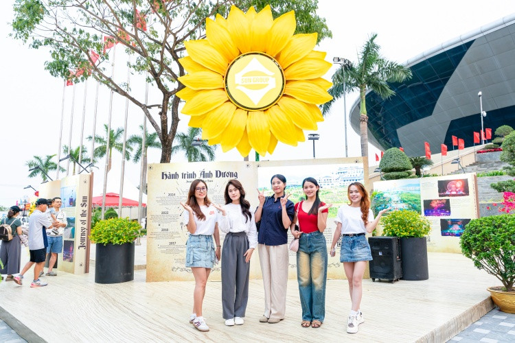 Người dân Đà Nẵng thích thú, hào hứng ghi lại kỷ niệm với bông hoa hướng dương rực rỡ. Được biết, đây là một phần của triển lãm “Hành trình Ánh Dương” của Tập đoàn Sun Group nằm trong khuôn khổ triển lãm '"Đà Nẵng - Phát triển và Hội nhập".