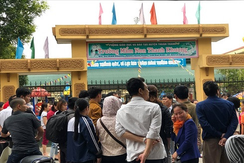 Phụ huynh học sinh đứng trước cổng trường mầm non Thanh Khương để chờ câu trả lời của cơ quan chức năng