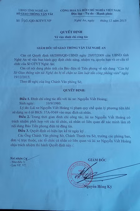Sáng 21-12, ông Nguyễn Hồng Kỳ, Giám đốc sở GTVT Nghệ An cho biết, đơn vị này đã ra quyết định buộc thôi việc với tài xế Nguyễn Viết Hoàng (SN 1980) là nhân viên lái xe của Sở vì đã vi phạm quy chế quản lý phương tiện khi sử dụng xe ô tô mang BKS 37A – 9569 vào mục đích cá nhân.