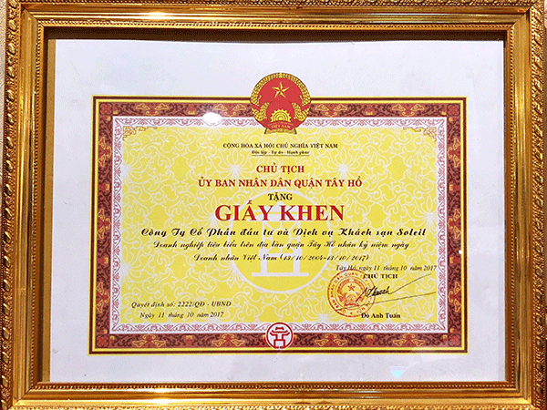Công ty CP Đầu tư & Dịch vụ khách sạn Soleil - chủ đầu tư dự án D’. Le Roi Soleil nhận giấy khen doanh nghiệp tiêu biểu của UBND quận Tây Hồ