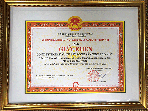 Công ty TNHH Đầu tư bất động sản Ngôi Sao Việt - Chủ đầu tư dự án D’. Capitale nhận giấy khen chấp hành tốt chính sách pháp luật thuế năm 2017 của UBND quận Đống Đa