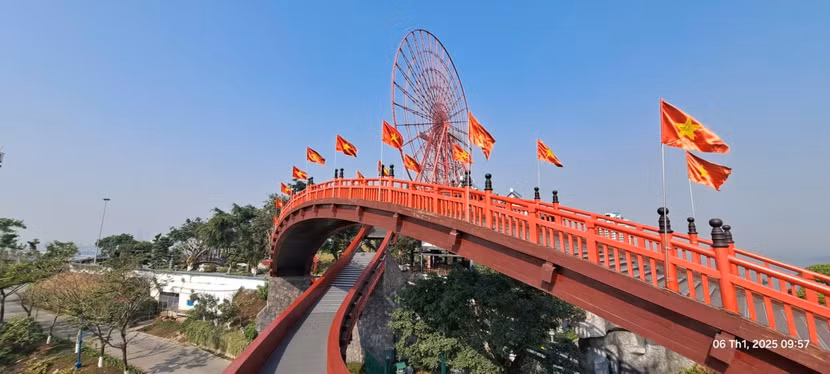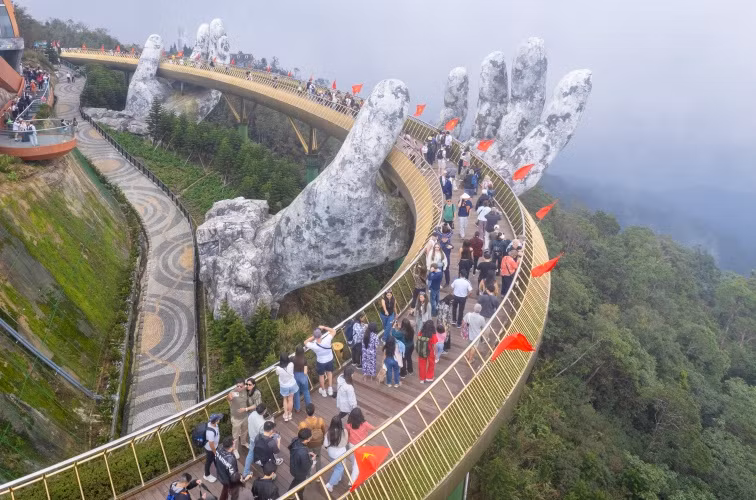 Trên đỉnh Bà Nà Hills, không khí ăn mừng chiến thắng cũng tràn trề hứng khởi khi cờ tổ quốc được treo dọc theo Cầu Vàng – cây cầu mang tính biểu tượng của du lịch Đà Nẵng. Ngay từ sáng sớm, hàng ngàn du khách đã đi cáp treo lên Bà Nà, cùng nhau hào hứng check-in với cờ tổ quốc bay phấp phới trên cây cầu đẹp tựa dải lụa vắt qua các tầng mây.