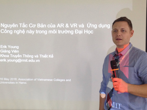 Đại học RMIT vinh dự được mời thuyết trình tại hội thảo, thạc sĩ Erik Young, giảng viên khoa Truyền thông & Thiết kế, đã chia sẻ những kinh nghiệm thực tiễn của RMIT Việt Nam về Thiết lập phòng thí nghiệm thực tế ảo hỗn hợp trong trường đại học.
