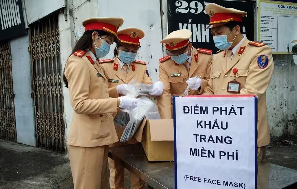 Lực lượng CSGT tổ chức nhiều điểm phát tặng khẩu trang miễn phí cho người dân phòng, chống hiệu quả dịch Covid-19