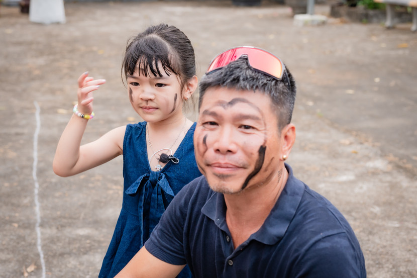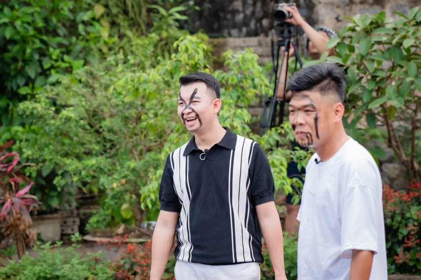 Và thế là, trên sân đình cổ kính, gương mặt các ông bố lần lượt trở thành “tác phẩm nghệ thuật”. Trung Ruồi được bôi hình tròn đen kịt, Neko Lê có hình trái tim, Thái Hòa được “tặng” một hình xiên “siêu ngầu”.