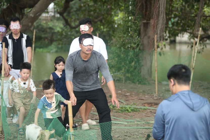 Tiếp nối không khí rộn ràng, các cặp bố con bước vào thử thách kế tiếp: bịt mắt bắt dê – một trò chơi tưởng đơn giản nhưng lại khiến ai cũng... hoa mắt chóng mặt.