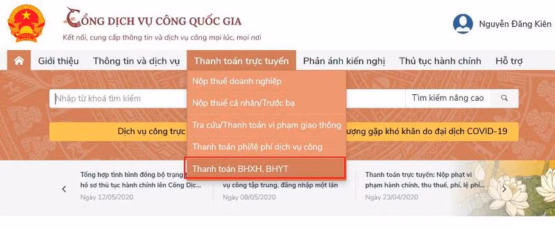 Bước 2: Trên Menu ở Trang chủ, bạn chọn “Thanh toán trực tuyến” rồi chọn “Thanh toán BHXH, BHYT”.