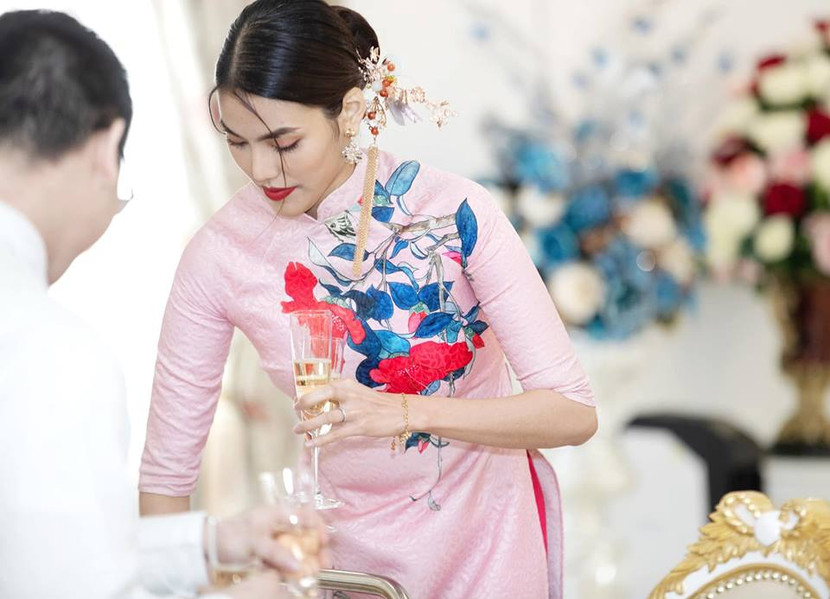 Lan Khuê mặc áo dài, để lộ vòng eo to bất thường