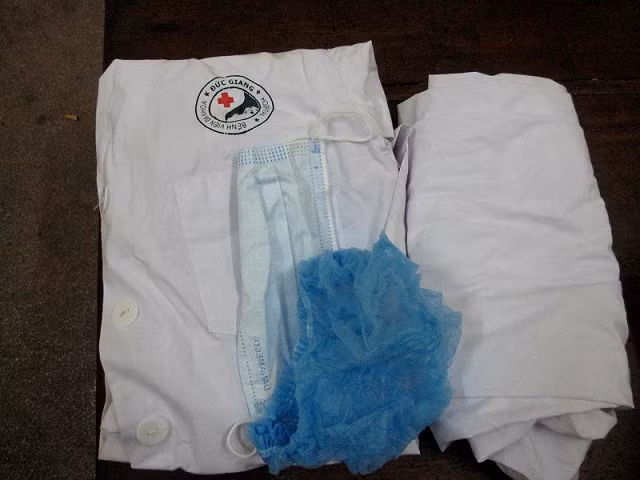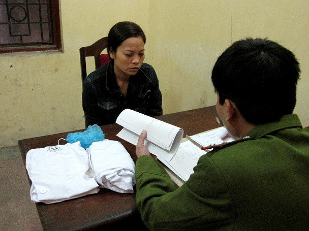 Đối tượng Nguyễn Thị Thìn bị CAP Phương Mai phối hợp với CAQ Đống Đa bắt giữ khi đang khoác trên mình áo blu trắng, bịt khẩu trang, mũ trùm đầu để lân la đến các phòng bệnh tại bệnh viện hòng giở hành vi lừa đảo.